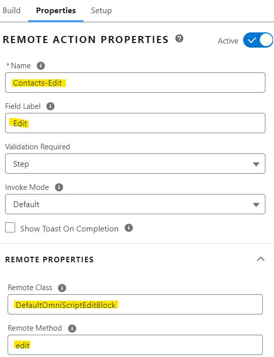 NOTE: As a best practice, set the name of the ‘Remote Action’ in the format EditBlockElementName-Action instead of just the Action name. This uniquely identifies the corresponding Edit Block action and performs the related DML operations, even if there are multiple edit blocks inside an Omniscript.